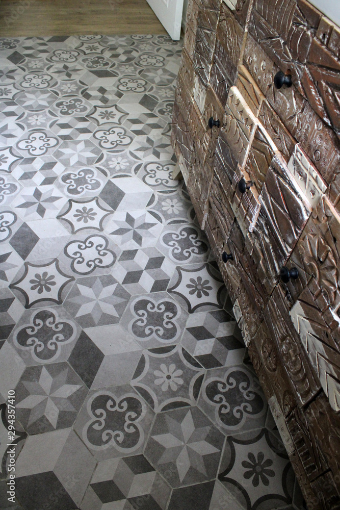 Carreaux ciment gris dans salle de bain, décoration intérieure maison