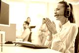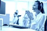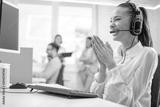 Cheerful, lucky and surprised female call center operator keeping hands together and looking at computer monitor.