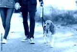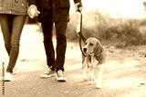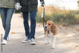 pet, domestic animal and people concept - couple walking with beagle dog on leash in autumn