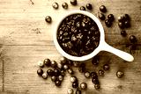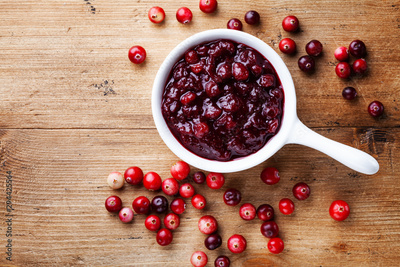 Cranberry sauce in ceramic saucepan with berries on wooden kitchen table from above.