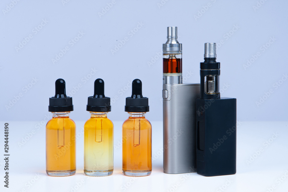Juice for vape. Vaping. Devices for the vaper and three bytes of liquid. Oils for vaping on the table. Sale of vaping liquids. Juice for e-cig. Vaper table. Refueling a vape device. Vape kit