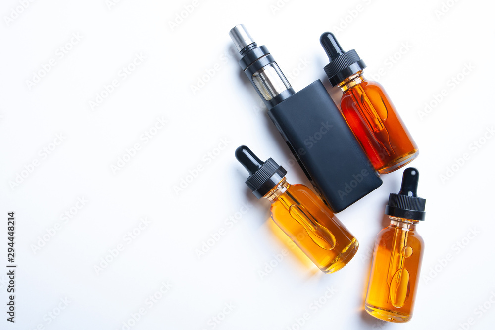 Vape Shope. Vaping. Vaping device and three bottles of oil. Juices for vape of different tastes. Oils for electronic cigarettes. Vaping liquids. Buy simple vape. Vaper set. Gift for the vaper