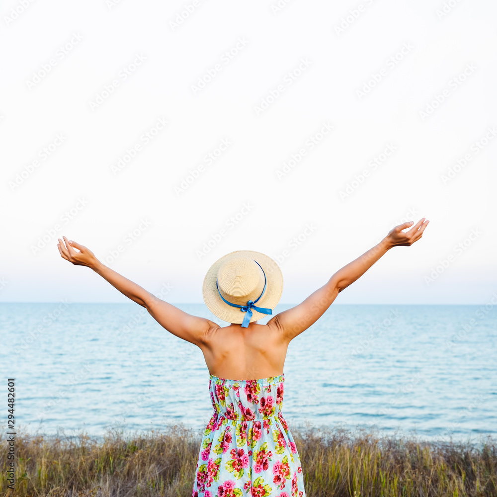 Young woman arms raised up to sky, celebrating freedom. Positive emotions feeling life perception success, peace of mind concept. Free Happy girl in summer meadow enjoying sea skyline. Text space.