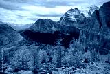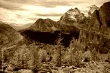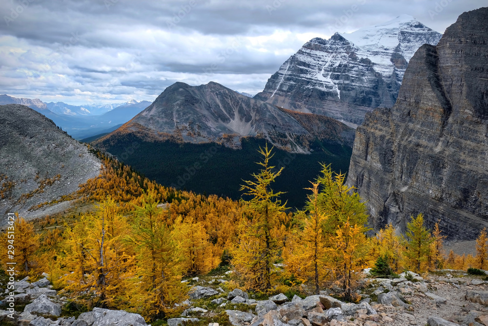 Scenic view of mountains and yellow autumn larch trees in Lake Louise area in Canadian Rockies. Fair view mountain hiking trail in Banff National Park. Alberta. Canada.