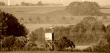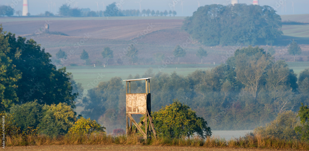 Hunting tower against the background of autumn fields shrouded in morning fog