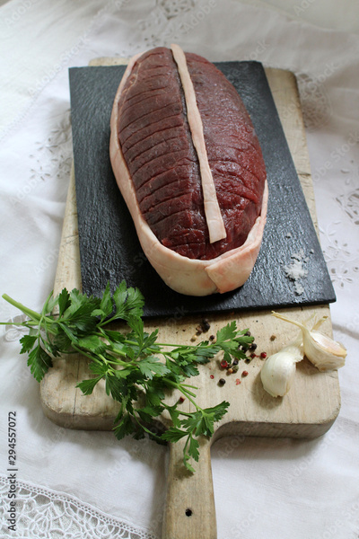 Rôti de boeuf cru, gros rosbeef sur fond ardoise