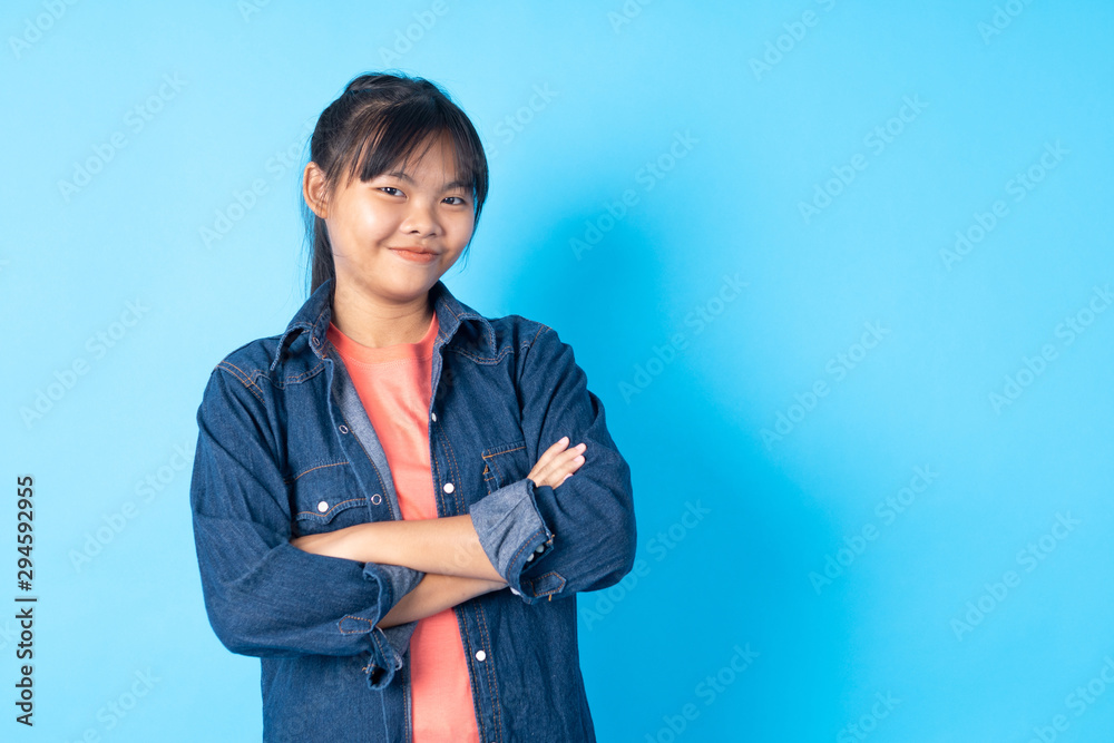 portrait of Asia girl, Thai teen smiled and looking camera on blue background in studio