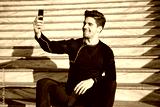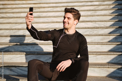 Young attractive smiling sporty man happily taking selfie on cellphone on stairs after workout outdoor