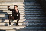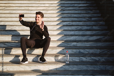 Young handsome sporty man happily showing hi hesture talking on video chat on cellphone after workout outdoor