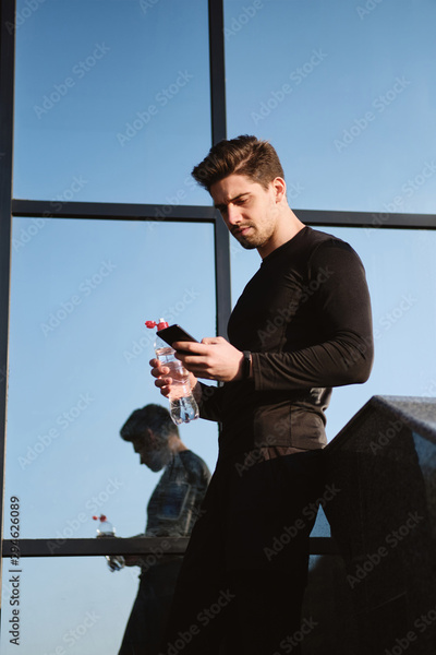 Young serious sporty man with bottle of pure water confidently using cellphone after workout outdoor