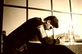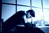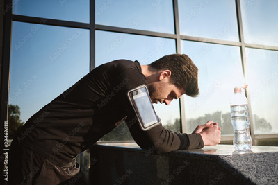 Young attractive tired sporty man resting after run outdoor