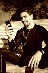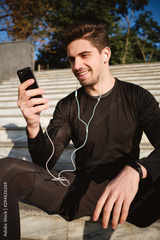 Young attractive sporty man in earphones happily using cellphone after workout outdoor