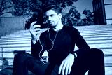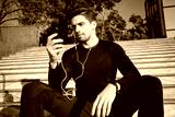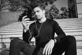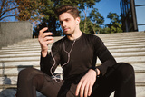 Young sporty man in earphones thoughtfully using cellphone after workout outdoor