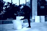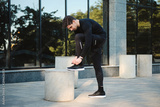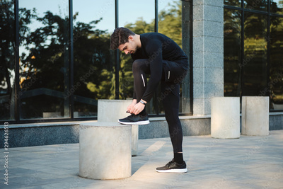 Side view of young attractive confident sporty man tying shoelaces on sneakers during workout on city street