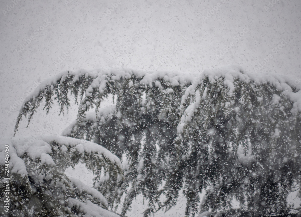 strong snowfall at pine tree