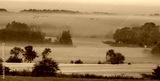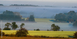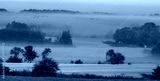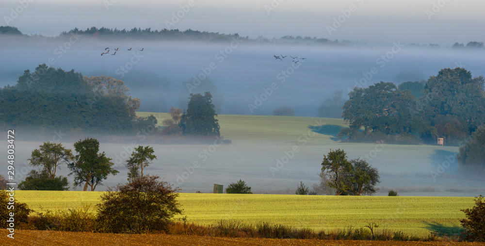 The key of cranes flying in the morning over misty fields and meadows in the autumn scenery
