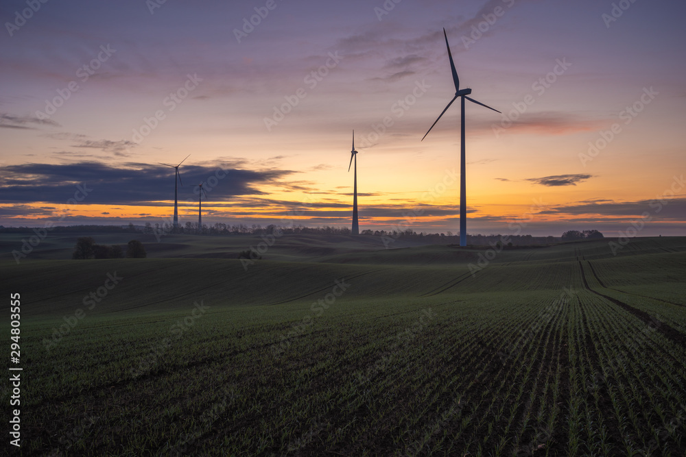 windmills on a field in Germany during a beautiful multicolored sunrise