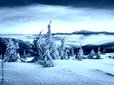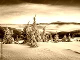 Frosty winter sunrise in Carpathian mountains with snow covered fir trees. Impressive morning scene of mountains hills covered by fog. Beauty of nature concept background.