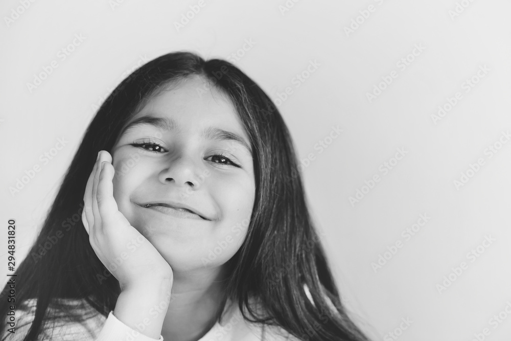 Portrait of a happy smiling child girl with long hear. Black and white image.