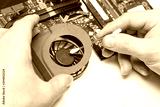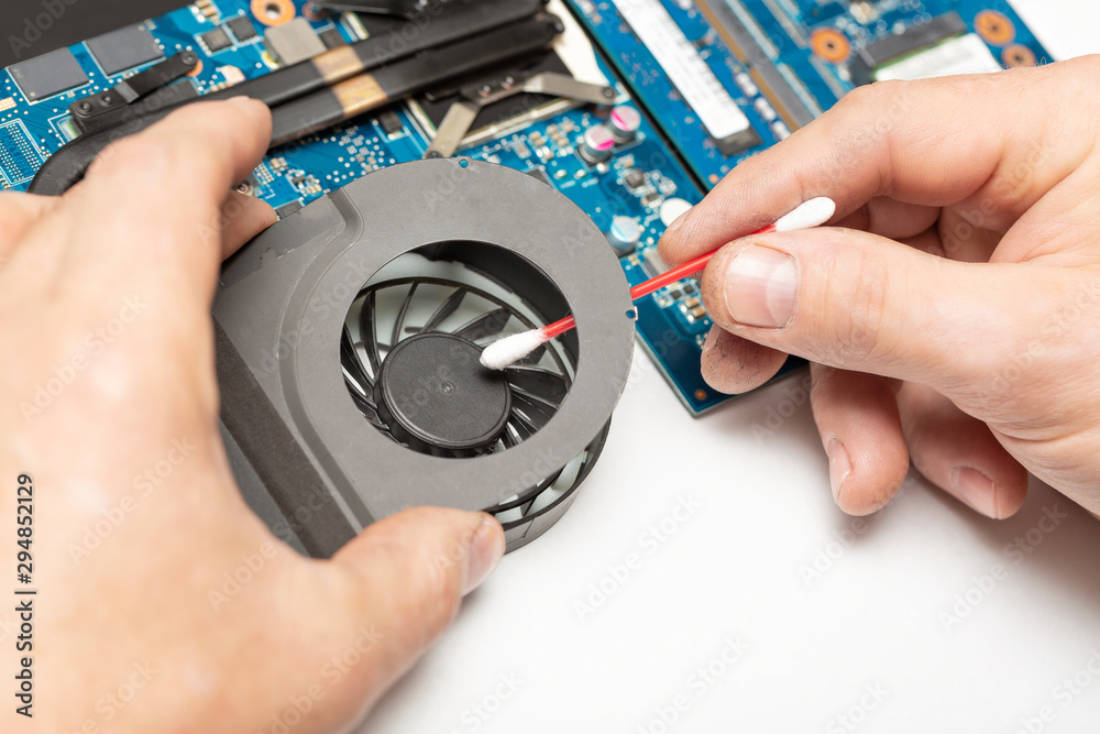 Computer service. Close up image of male technician engineer hand cleaning the dust from the laptop computer fan near the circuit board with a cotton bud.