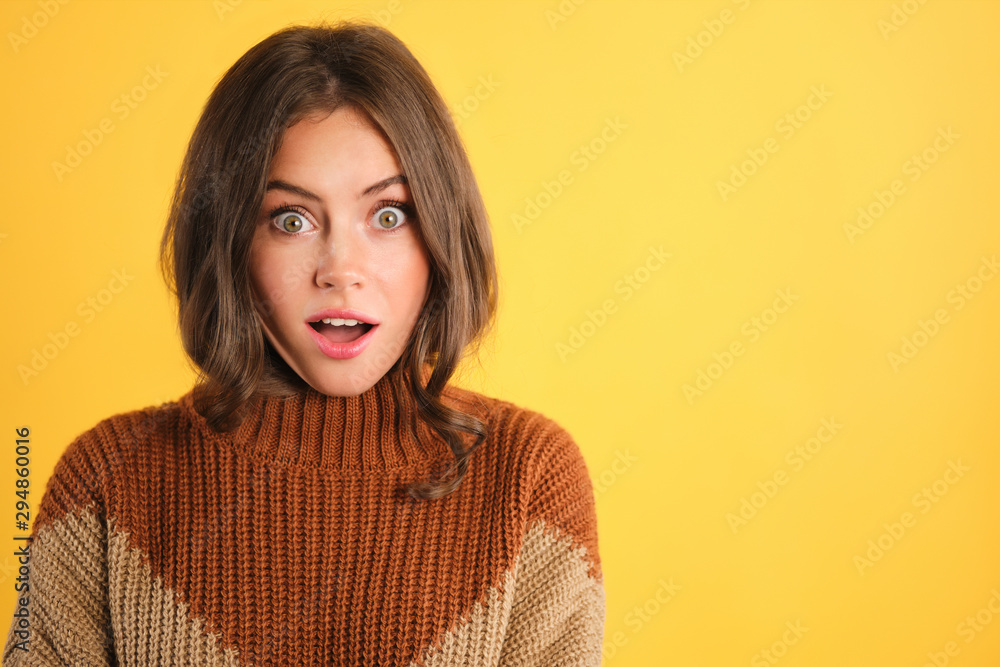 Portrait of shocked girl in cozy sweater amazedly looking in camera over colorful background