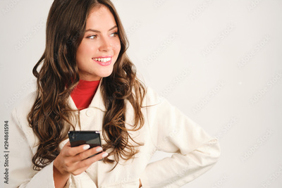 Portrait of attractive casual girl with cellphone happily looking aside isolated