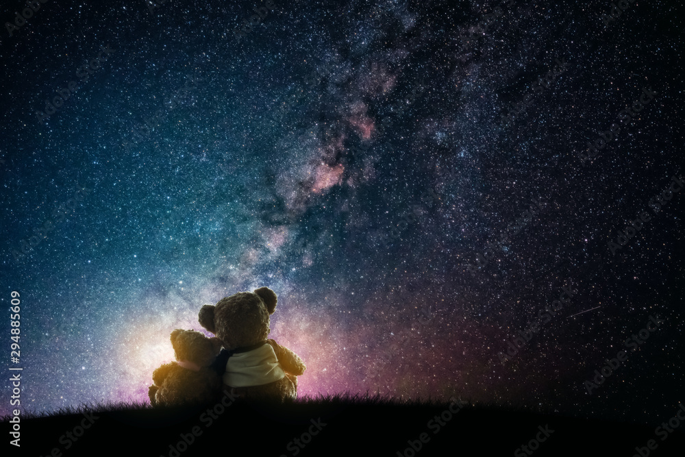 Couple love teddy bear (non branded) hugging on starry night sky, love concept