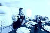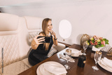 beautiful young girl in the cabin of a business class airplane with a phone in her hands comfortable luxury travel
