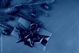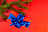 Red gift box with a blue bow near fir branches on a red background. a Christmas gift