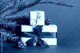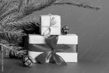 Christmas composition. Green gift boxes under the Christmas tree on a red background. a Christmas gift