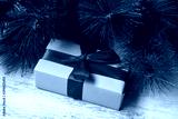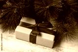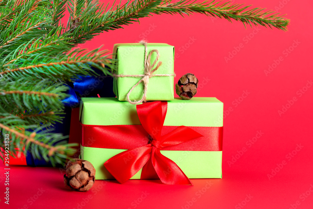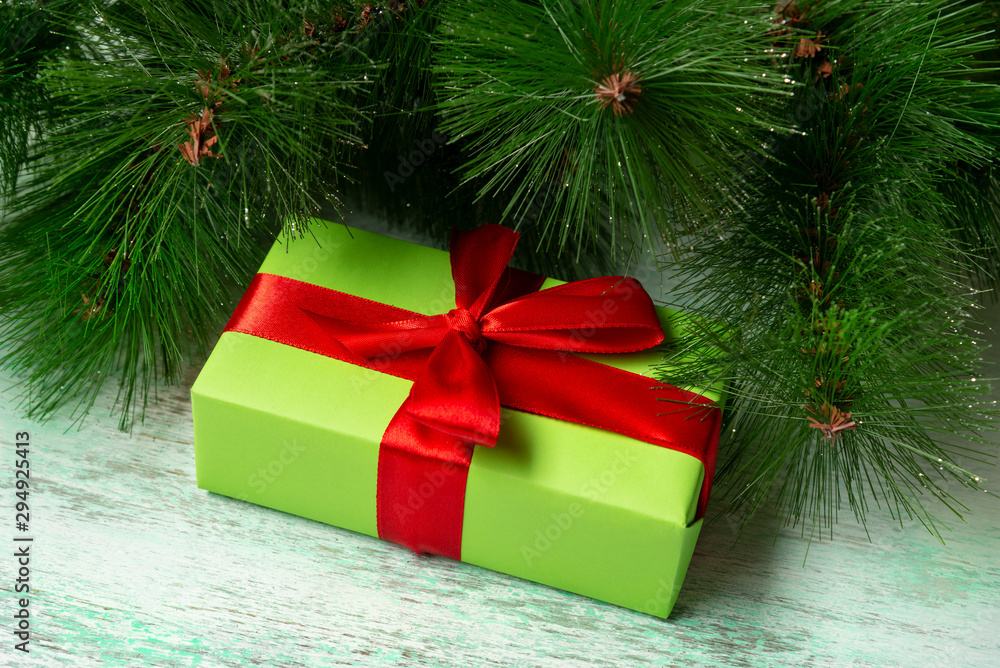 A wrapped green gift with a red ribbon lies under a Christmas tree on a wooden floor