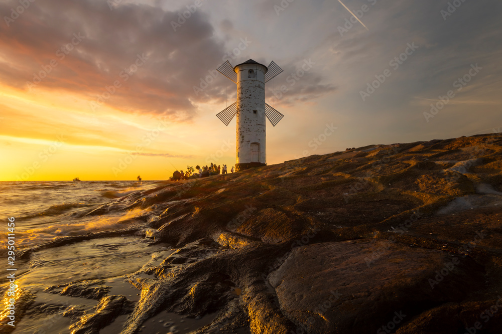 navigation sign in the shape of a white windmill-Swinoujscie, Baltic Sea