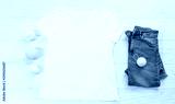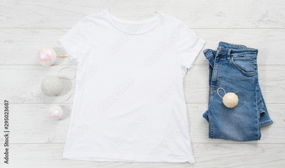 Close up white blank template t shirt with copy space and Christmas Holiday concept. Top view mockup t-shirt and jeans on white wooden background. Happy New Year decorations accessories. Xmas outfit