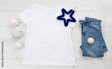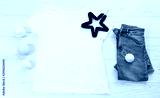 Close up white blank template t shirt with copy space and Christmas Holiday concept. Top view mockup t-shirt and jeans on white wooden background. Happy New Year decorations accessories. Xmas outfit