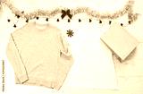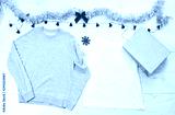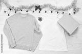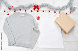 Close up white blank template t shirt, sweatshirt hoodie with copy space. Christmas Holiday concept. Top view mockup paper bag t-shirt, red bow on white wooden background. Happy New Year decorations