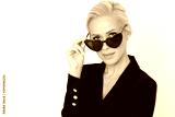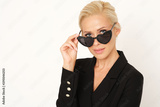 Beautiful portrait of businesswoman wearing black heart shaped sunglasses.