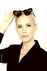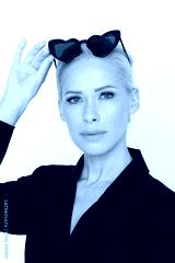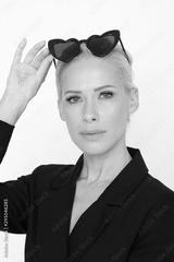 Beautiful portrait of businesswoman wearing black heart shaped sunglasses.
