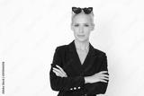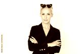 Beautiful portrait of businesswoman wearing black heart shaped sunglasses.