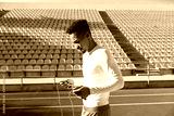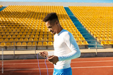 Young attractive African American sportsman with skipping rope on workout at stadium