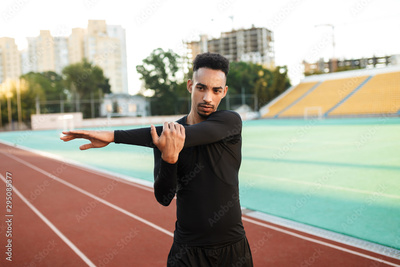 Young serious African American sportsman stretching preparing for run on racetrack at stadium