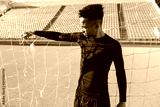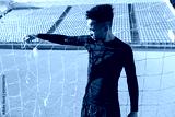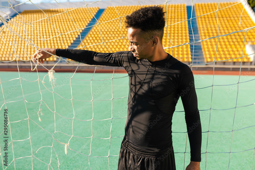 Young handsome African American sportsman standing in football goal at stadium