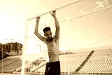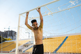 Young attractive shirtless African American sportsman near football goal after game at stadium
