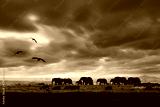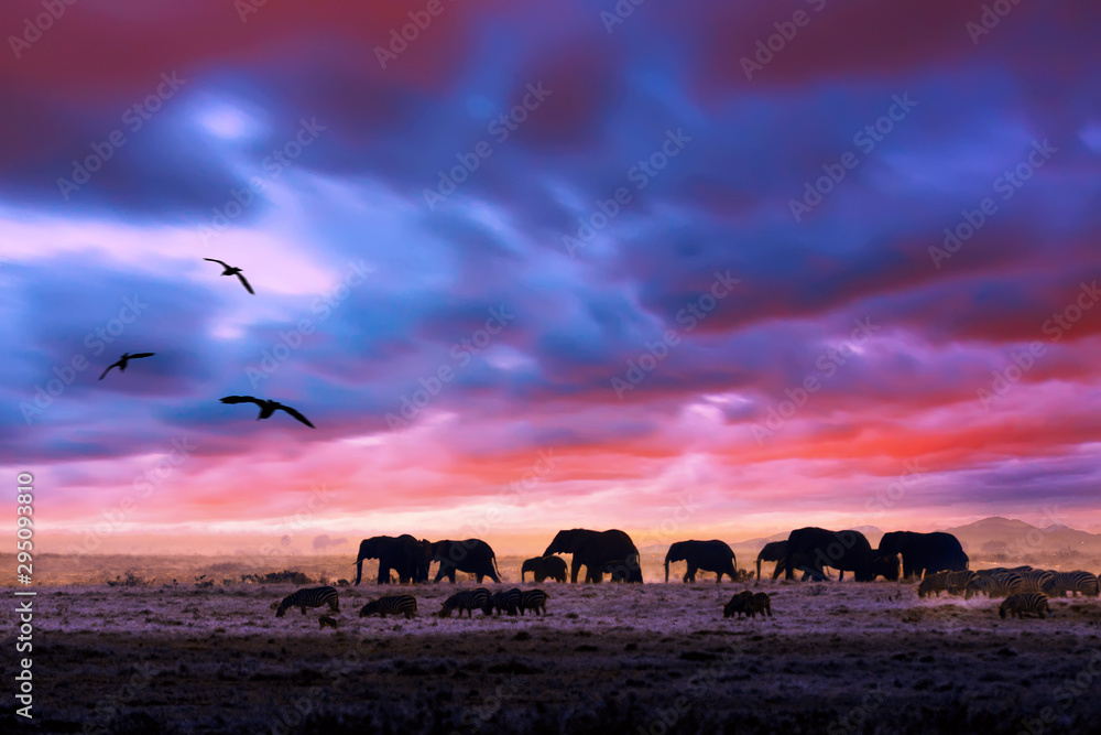 Amazing african dramatic sunset with walking elephants in savannah. Artistic fantastic safari landscape in Masai Mara National Reserve, Kenya.