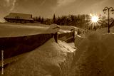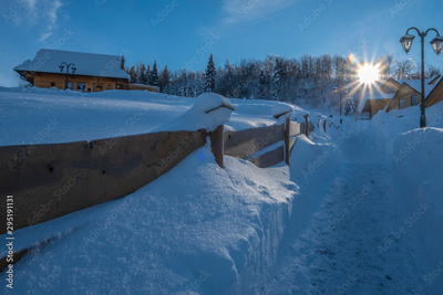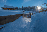 Small wooden village in mountains covered by snow.