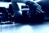Athlete worried, having trouble. Person tired after exercise and workout. Overtraining. Exhausted man lying on floor resting after heavy strenght training in home gym. Depressed man. Aching head.