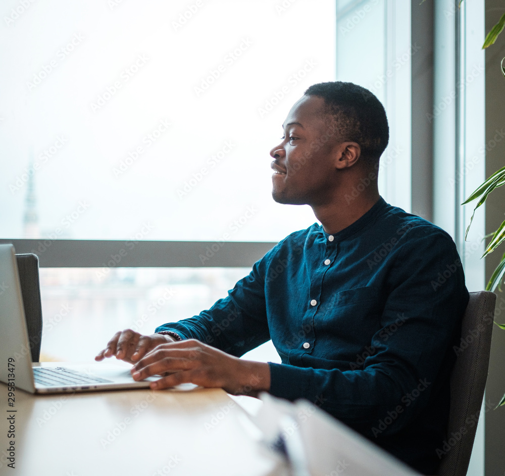 Young man working on a laptop in public library