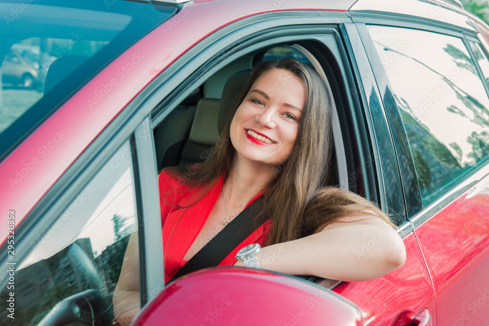 Happy smiling woman in a car. Driving. Portrait of young caucasian business lady in red clothes looking at camera while sitting behind the wheel red car. Selective focus, copy space.