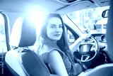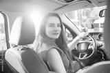 Back view Portrait of business lady, caucasian young woman driver looking at camera and smiling over her shoulder while driving a car. Sunset back light. Selective focus, copy space. Inside view.