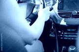 Car key in ignition. Start, stop or accelerate engine. Car shape keyfob on vehicle dashboard background during driving. Woman driver. Selective focus, Copy space.