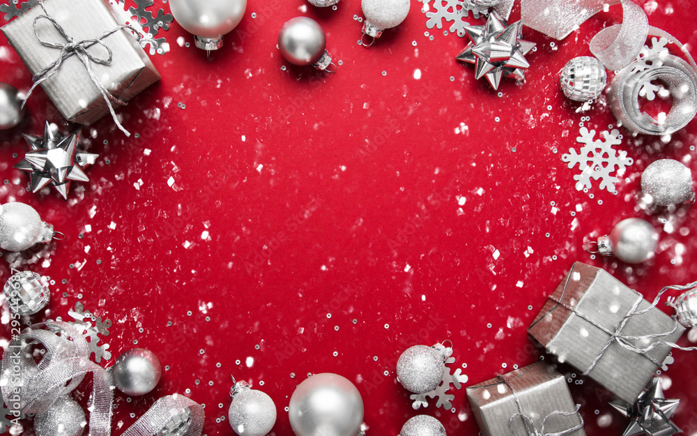 Christmas and New Year holiday background. Xmas greeting card. Christmas silver ornaments on red background top view.